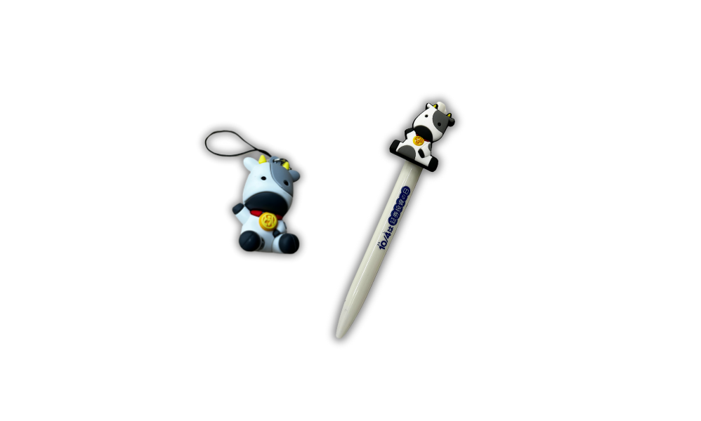 投資会社の周年記念グッズとして、キャラクターデザイン付きのボールペンを作成。 このほか「携帯ファン」や「靴ベラ」、変わったものとしては「御守り」がオリジナルアイテムの候補にあがりました。