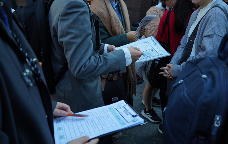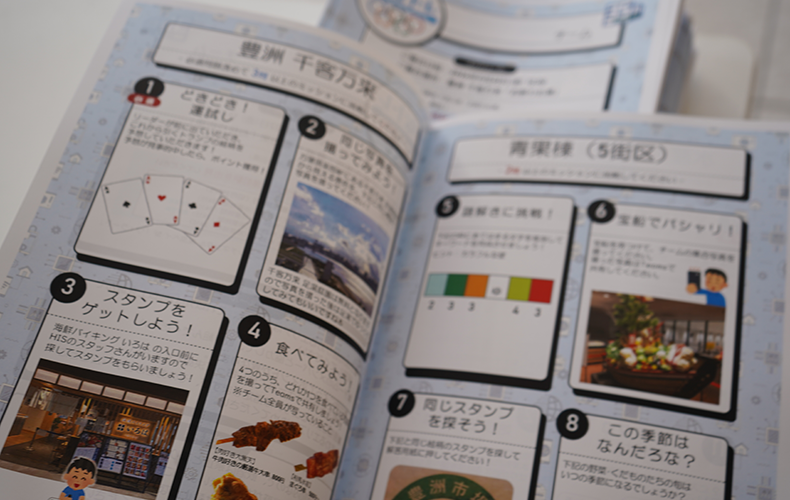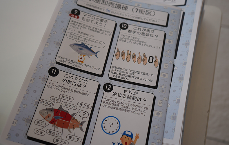 1チーム10名ほどのチームに分かれて、豊洲市場に関する謎を解くチームビルディングを実施。豊洲 千客万来「いろは」や万葉倶楽部、豊洲市場の「水産エリア」「青果エリア」などを回り、タスクの実行と謎を解いて、解答用紙に記入していきます。謎解きをすることでチーム内の会話も弾み、コミュニケーションが活性化していました。