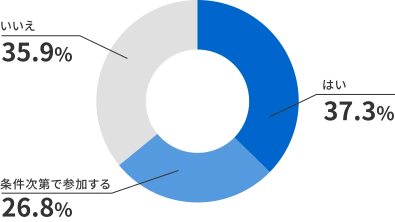 意識調査の中で、今後のイベントへの参加意向を尋ねたところ、「積極的に参加したい(はい)」と答えた人は37.3%に留まりました。しかし、ここで注目すべきは「条件次第で参加する」と回答した層が26.8%存在することです。つまり、現在「積極的ではない」層の中にも、環境や内容が整えば参加に転じるポテンシャルを持つ社員が4人に1人以上いることを示しています。