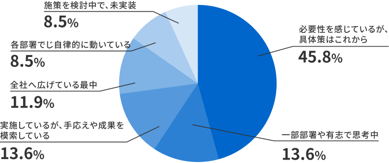 当社が2026年2月に開催した、SX推進をテーマにしたセミナー(※1)の申込時に実施したアンケートでは、SXへの取り組みについて「必要性は感じているが、具体策はこれから」と答えた企業は45.8%に達しました。注目すべきは、重要性を否定する声ではなく、「重要性は理解しているが、動けない」というジレンマです。約半数の企業が、最初の一歩を模索したままでいる、これが今のリアルな現在地なのです。