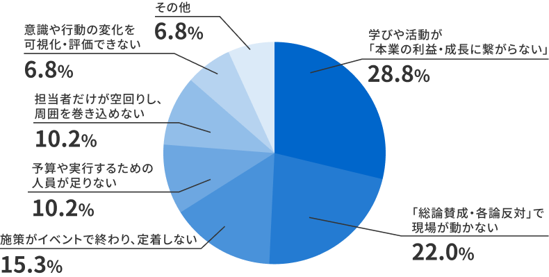 そして、この「本業との距離感」に拍車をかけているのが、僅差で続く2位の課題、「『総論賛成・各論反対』で現場が動かない(22.0%)」という現実です。