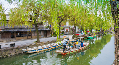 柳川市の掘割を「どんこ舟」で巡る川下り。季節の花や白壁の美しい街並みなどを眺めながら、船頭の軽妙なガイドや歌声とともに城下町の情緒を味わえます。