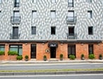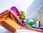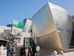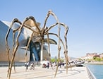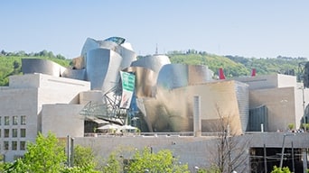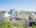 パピーの愛称で親しまれる生け花でつくられた犬の現代アートが入り口で迎えてくれる美術館。チタンでできた建物は、見る角度によってさまざまなモノを連想させるアートとなっています。 -