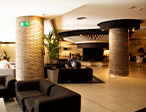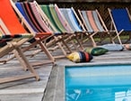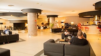入り口に目立つカフェや、エントランスの奥にあるグランドピアノやビリヤード台の置かれたゆったりできるラウンジが特徴。中庭にあるプールもシーズン中は観光客で賑わいます。 -