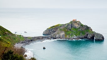 スペインの最も美しい風景にも選ばれた海に浮かぶ教会。教会までは駐車場から急勾配か遠回りのなだらかな道で山を下り、再び島の階段を上ります。教会では3回鐘を鳴らすと願いが叶うという伝説も。 -