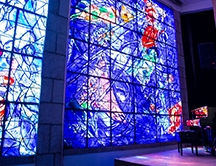 旧約聖書の創世記をテーマにしたマルク・シャガール作の絵画17作を寄贈したことで誕生した、ニースの街の高台に立つ国立美術館。巨大な紺碧のステンドグラスは、見る者を圧倒します。