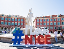 ニースの中心にある広場。噴水前はニース観光の記念写真用モニュメントも設置されたフォトスポット。大きな広場を囲むように7体の人物像アートがあるのも見逃せません。