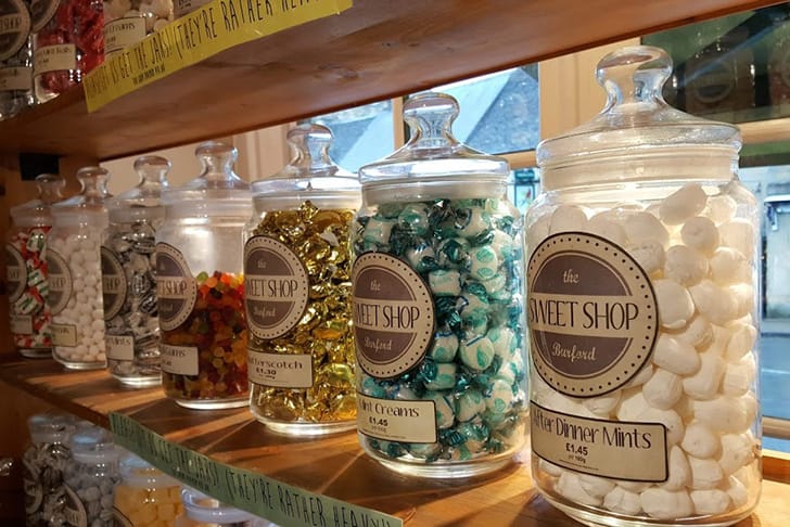 バーフォード スウィートショップ丘陵に沿った坂道のハイ・ストリートに、アンティークショップや雑貨店、カフェやパブが軒を連ねます。お土産用の特に可愛らしい柄にパックされたスイーツが有名で人気があります。 -