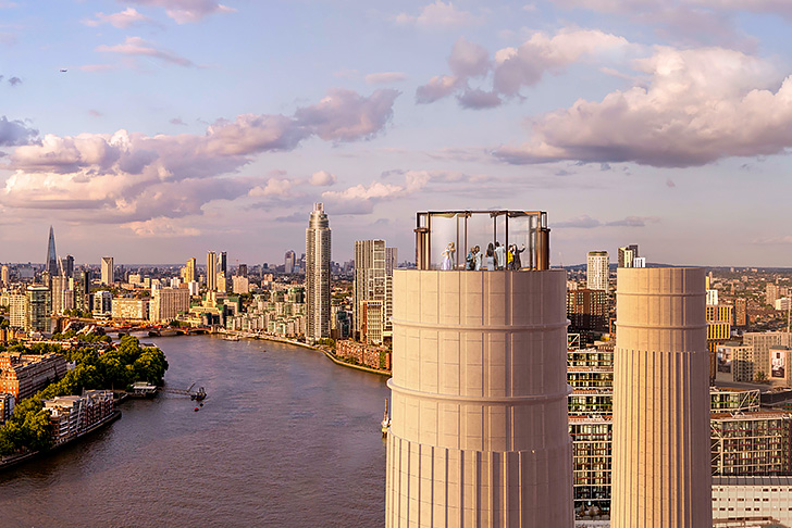 バタシー発電所火力発電所を再開発し、2023年10月にオープンした複合商業施設。施設内には、109メートルの高さまでエレベーターで昇り、ロンドンの景色を360度見渡せる新しい展望スポット「LIFT109」があります。 -