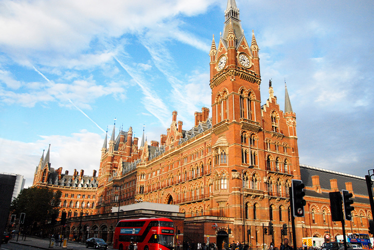 キングス・クロス駅コンコース内では、オフィシャルショップに隣接する「9 3/4番線」の表示と、壁に半分吸い込まれたカートと共に記念撮影ができます。同じく映画に登場した、お隣のセント・パンクラス駅の重厚な外観も必見。