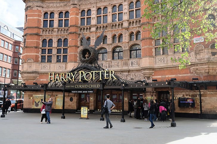 映画「ハリー・ポッター」シリーズの続編である芝居「ハリー・ポッターと呪いの子」を上演中の、ソーホーにある劇場。2部構成で上演時間は約6時間という長丁場ながら、チケットは完売続出の人気公演です。 -