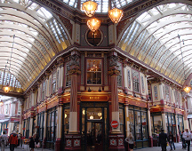 レデンホール・マーケット19世紀ヴィクトリア時代の面影を残す、全天候型のマーケット。レストランやショップが軒を連ね、映画「ハリー・ポッター」シリーズのダイアゴン横町のモデルにもなっています。魔法使いのパブ「割れ鍋」のロケ地は、青い外観の眼鏡店。 -
