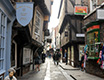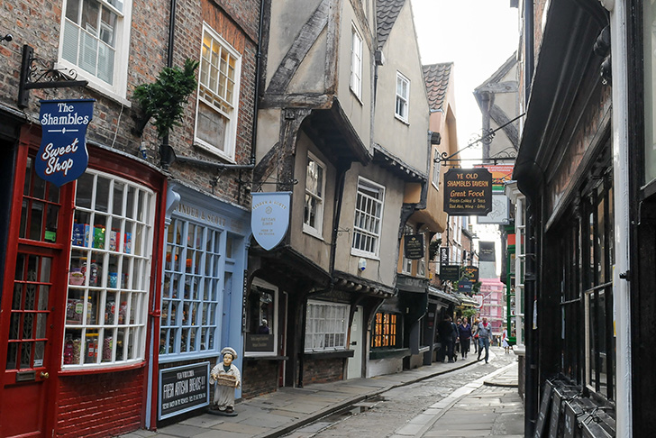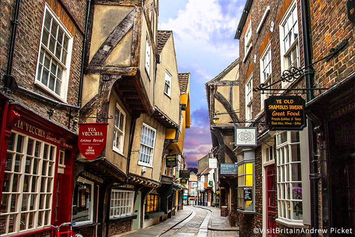 シャンブルズ通りとウース川岸の風景中世の面影をそのまま残す「シャンブルズ通り」は、ヨークでもっとも有名な石畳の路地。上階にいくほど突き出しているユニークな建物が軒を連ねています。ウース川の河畔からシャンブルズ、ヨーク大聖堂へと散策を楽しんで。 -
