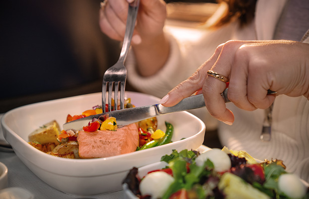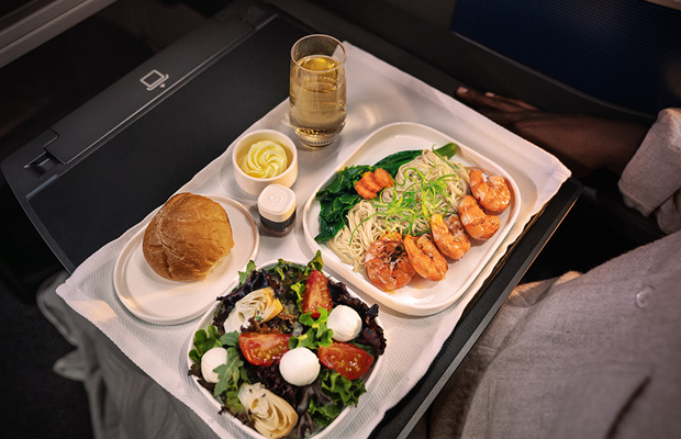 機内食はトロッタープロジェクトの著名なシェフたちと開発した機内食を提供。日本発着のフライトでは日本食もご用意しています。厳選されたワインやシャンパン、クラフトビールとともにお食事をお楽しみいただけます。
