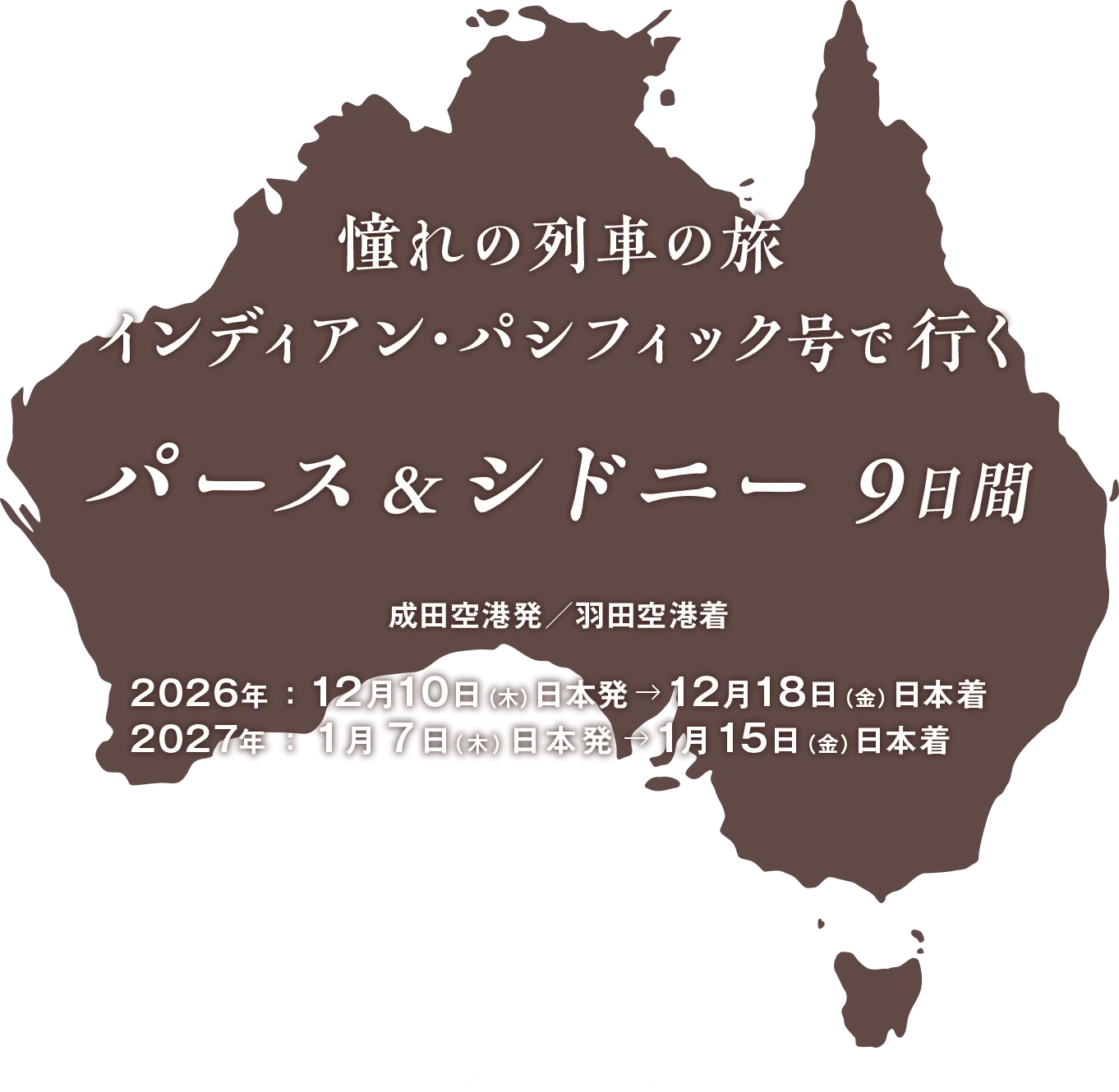 ANAビジネスクラスで行く!憧れの「インディアン・パシフィック号」の旅 プラチナ・ルームに滞在!パース&シドニー9日間[パース]ダクストンホテル パース/[シドニー]リッジス ワールドスクエア シドニーに滞在2,650,000円(燃油サーチャージ込み)2026/12/10~2027/01/07出発 -