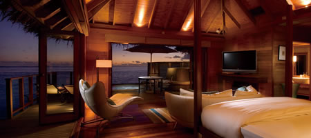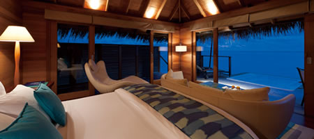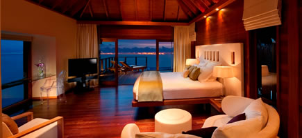 水上ヴィラ 部屋の造りはシンプルながらとても洗練されたデザインで人気。※12際未満の宿泊不可