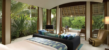 プール付きデラックスビーチヴィラ 文字通りビーチに立ち並ぶバンガロー。ホテルの主要施設に程近い立地と、目の前のビーチとそれに続く海が自慢。