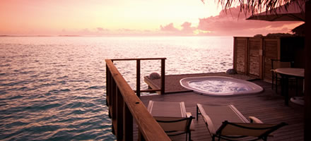スーペリア水上ヴィラ 水上ヴィラのデッキにジャグジーがあるタイプのお部屋。部屋の造りはシンプルながらとても洗練されたデザイン。※12歳未満の宿泊不可 water spa & spa retreat