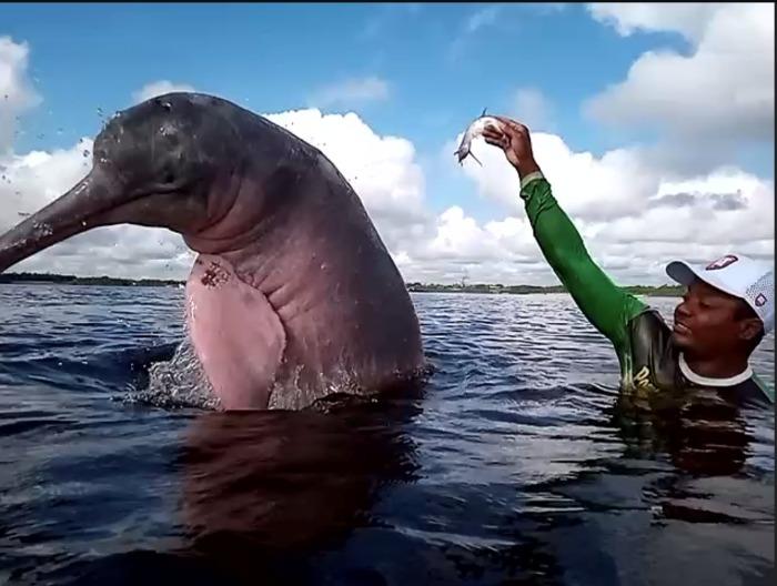 アマゾン川では、ピンクイルカがクチバシのような細長い口を出しくれたり、